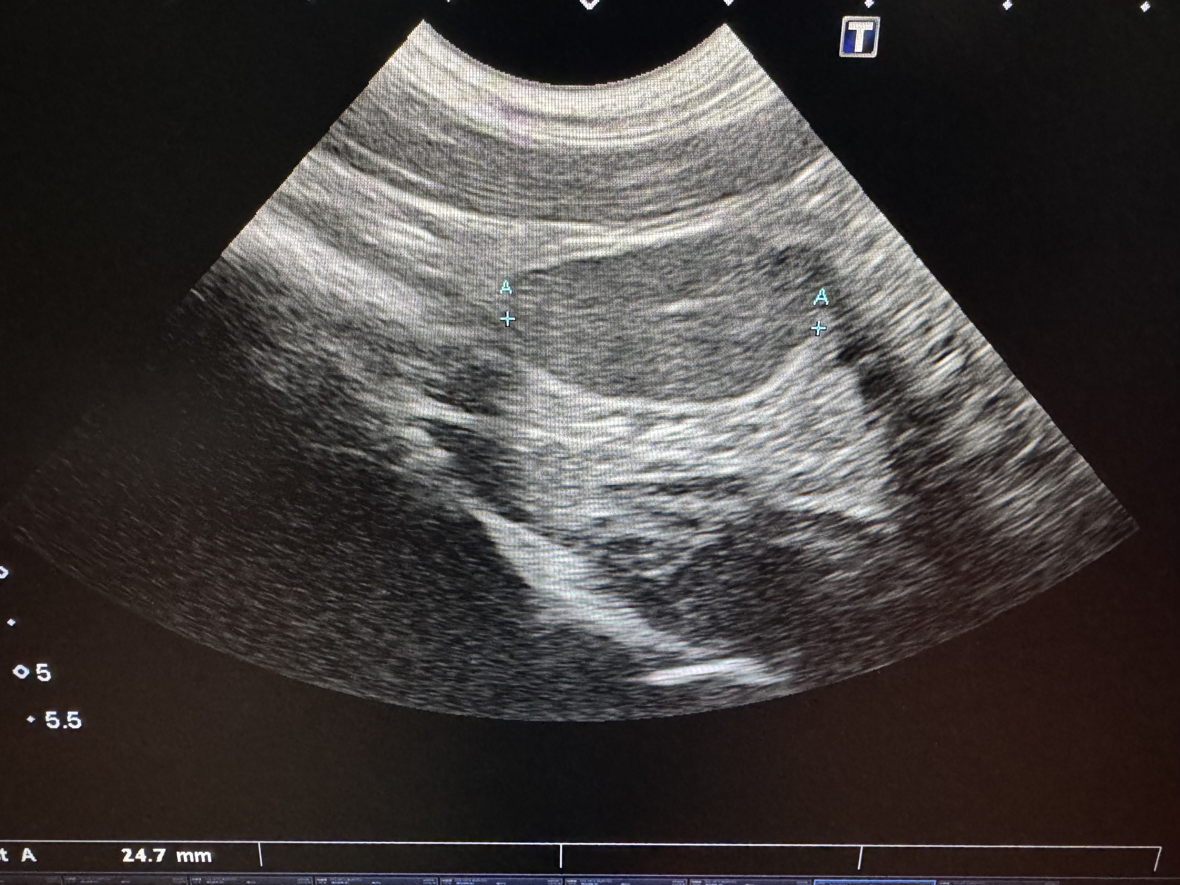 この写真は1歳のボーダーコリーの男の子の腹腔内停留精巣の腹部エコーの図です。陰嚢内に精巣が一つしか触知されず、腹部エコーによって膀胱の右鼠径間付近のお腹の中に精巣があることがわかった事例です。この子はこの後、開腹手術によって安全に去勢手術を行うことができましたので、精巣腫瘍になるリスクを事前に抑えることができました。