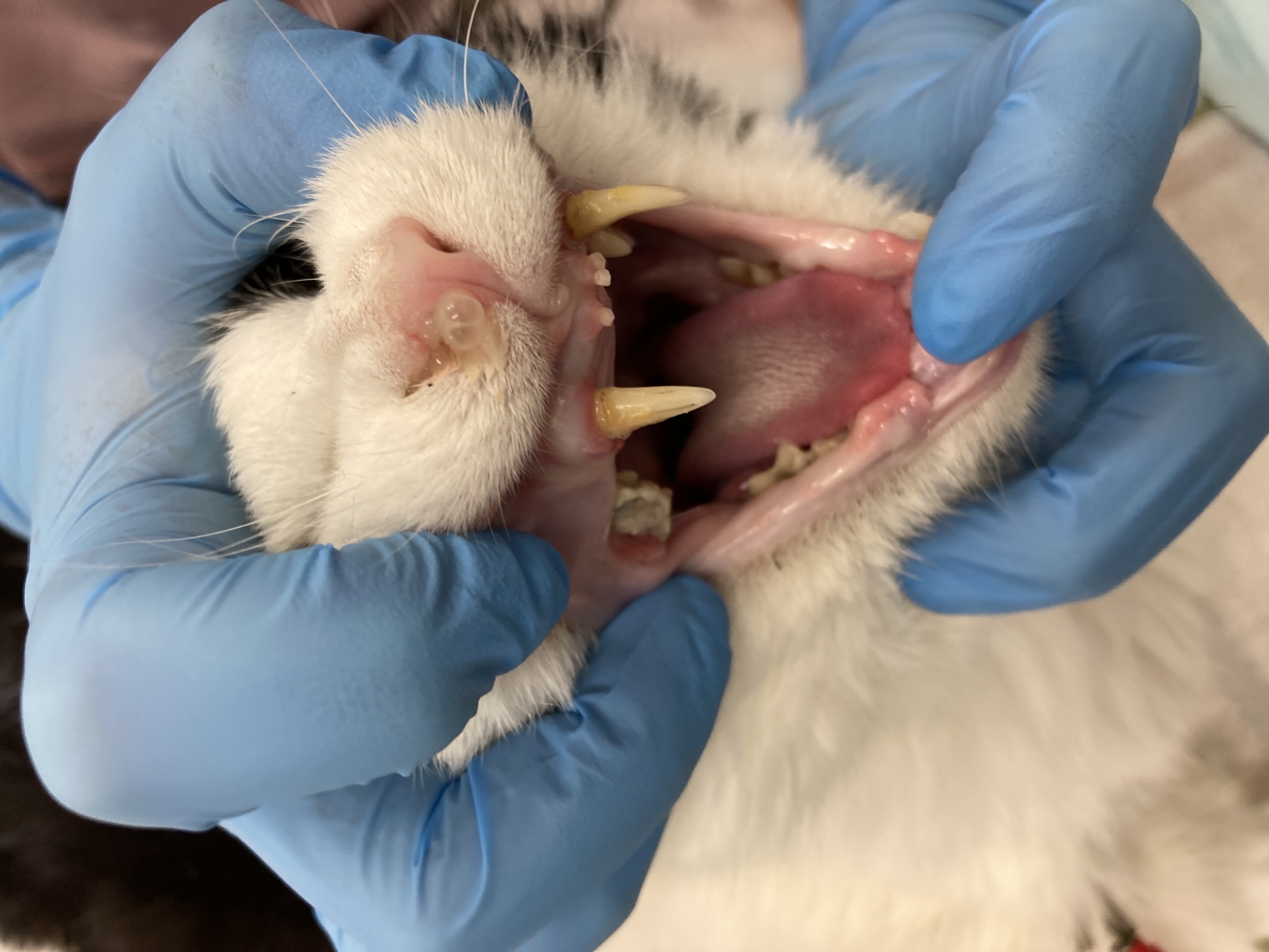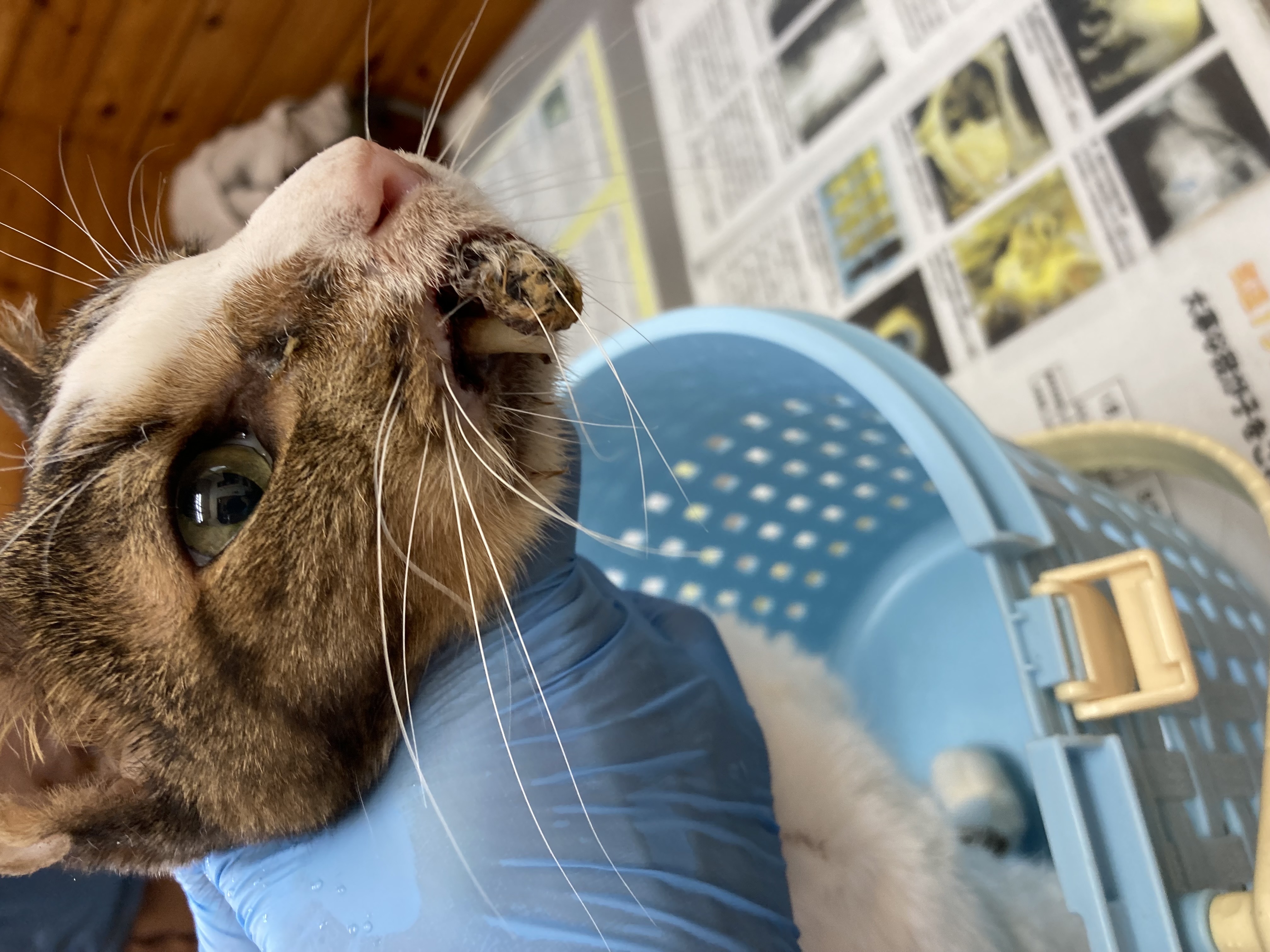 この子は右の犬歯の重度の歯根膿瘍のため、食欲が低下し、唇の皮膚がただれ壊死しています。慢性腎不全を持っているため、呼気中に尿毒症物質が出ることにより歯周病と栄養状態が悪化してしまったことも関与しています。歯がぐらついていたため、局所麻酔によって障害した犬歯を抜歯し、壊死した皮膚を切除しました。