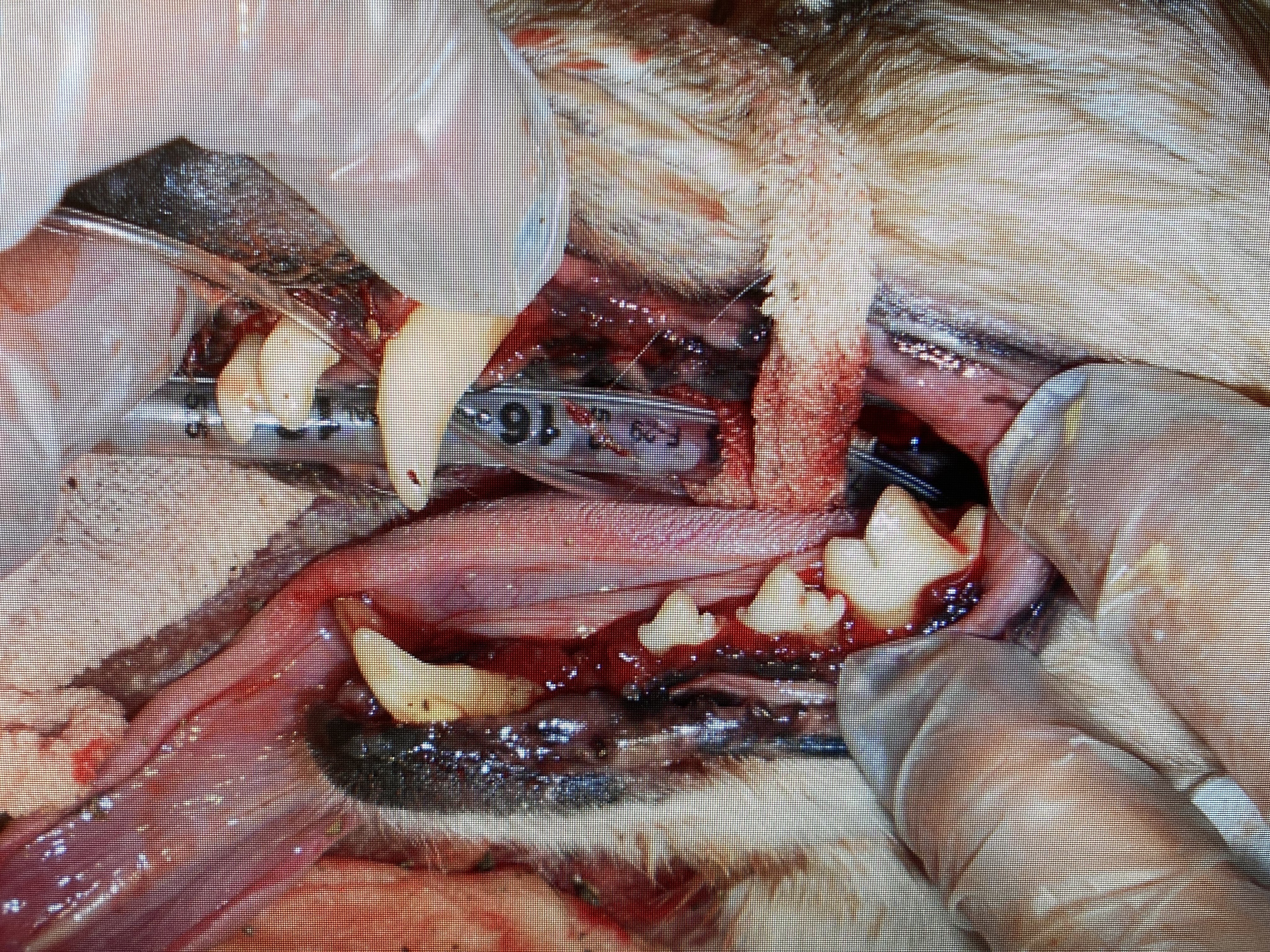 この子は重度の歯石の付着による歯周炎で麻酔下で歯石除去を行なっています。ここまで重度に歯石が付いていると抜歯による対応が必要になります。