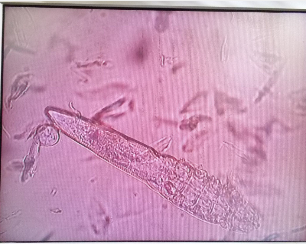 そうはした掻爬物を顕微鏡で観察すると目に見えない大きさの寄生虫が検出されることがあります。写真はニキビダニ(アカラス)の写真です。