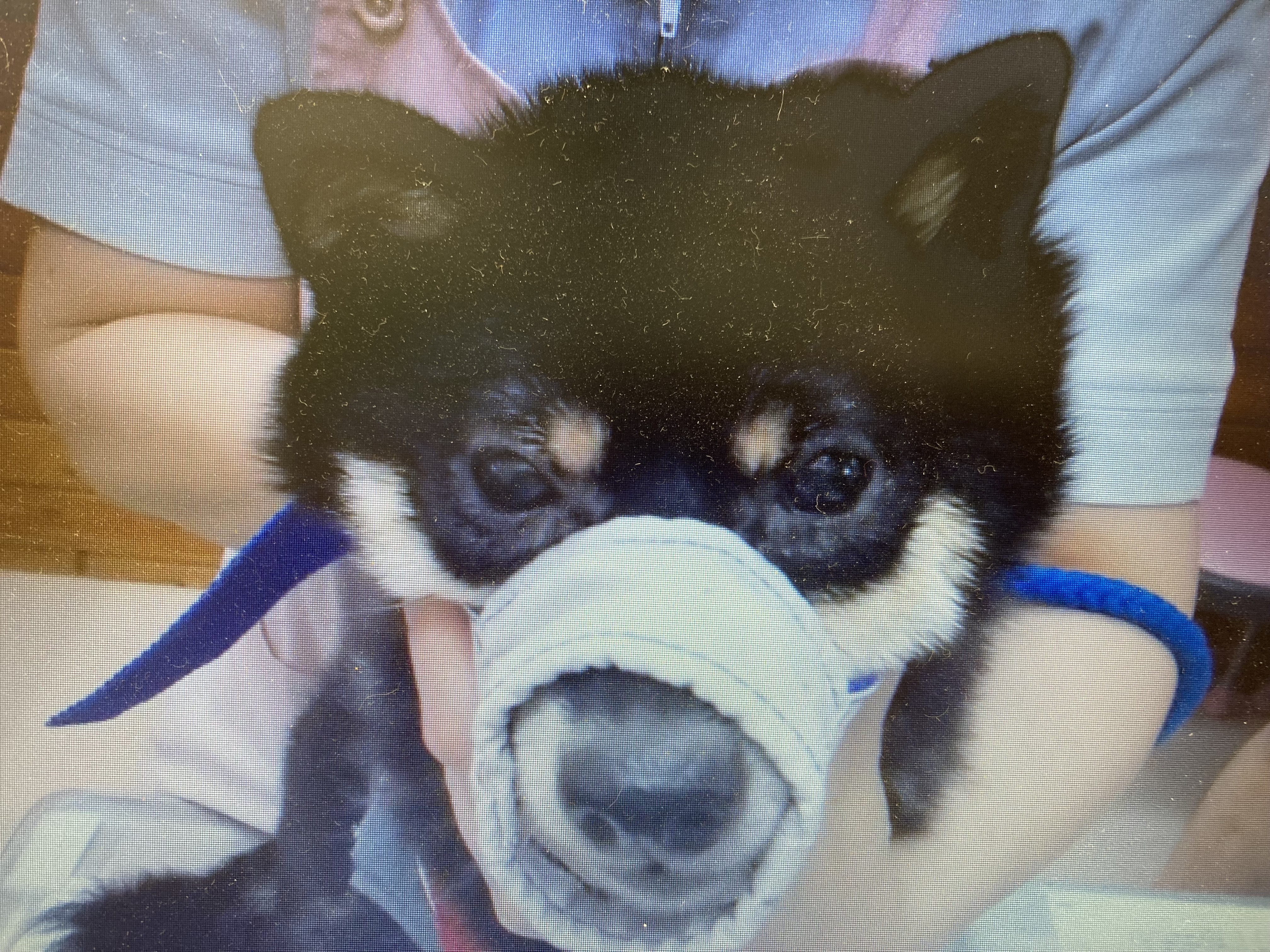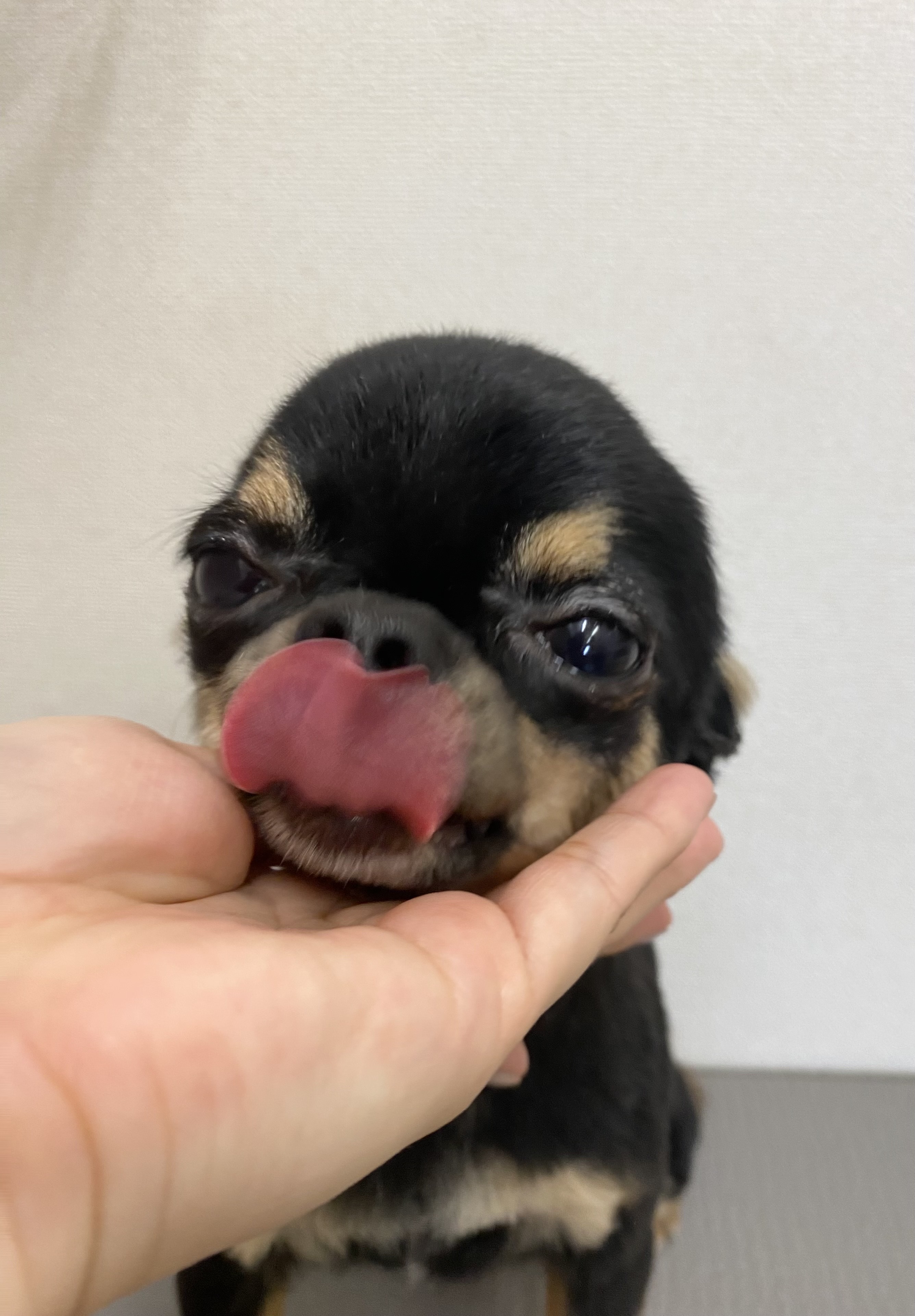 チワワの子犬ですが、両目とも縁取られるように毛が抜けて、まぶたがやや腫れぼったい感じがします。このような病変が「皮膚と粘膜の変わり目」の皮膚病変で、アレルギーによる皮膚反応が生じている可能性を考えます。