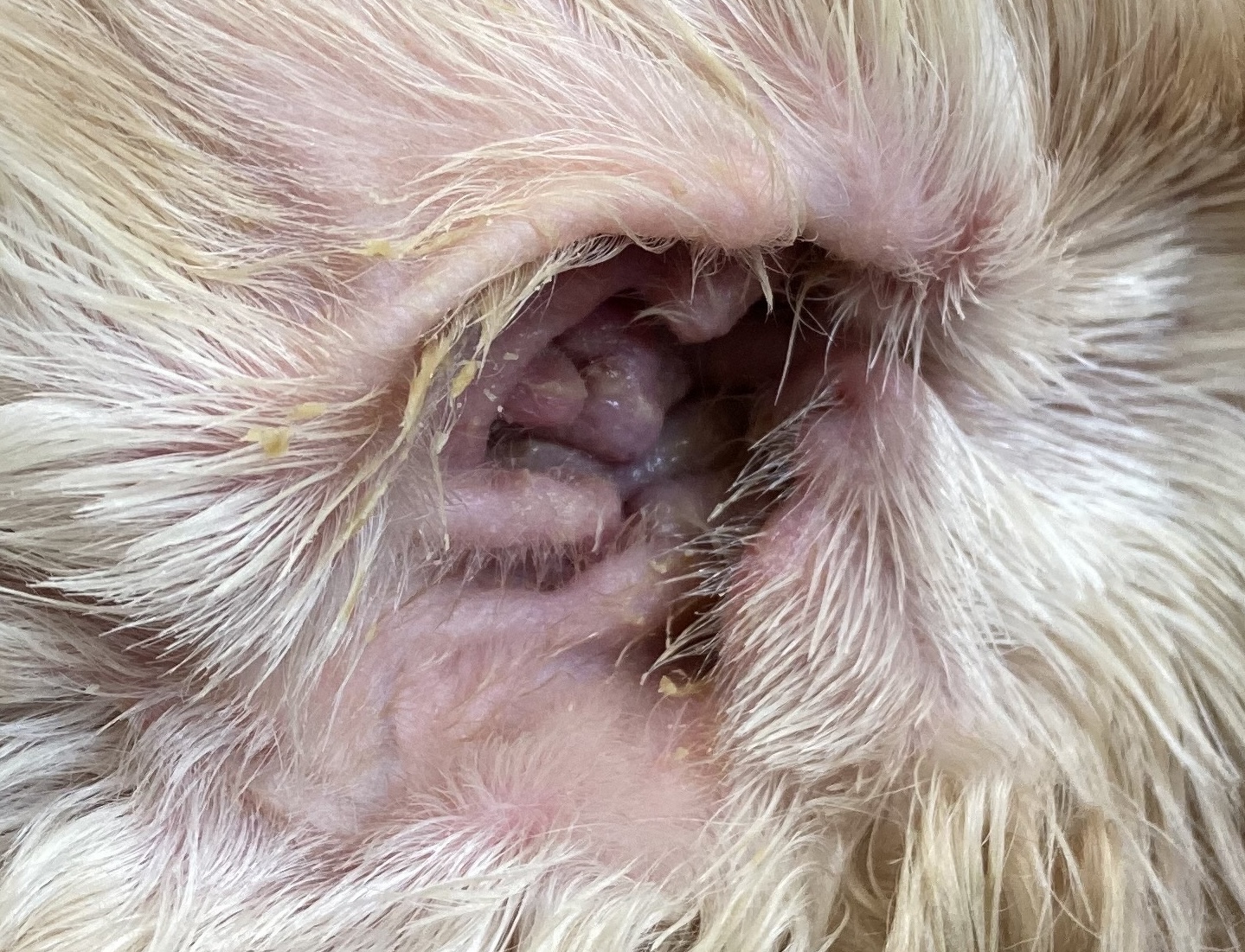 写真のように外耳道が腫れ上がってしまうと、耳道内の換気が悪化し、温度と湿度が高い状態が維持され、おまけに嫌気性環境(酸素や空気に触れにくい状態)になります。嫌気性環境ではある種の細菌が繁殖しやすくなるため、細菌感染が起こるとその増殖をコントロールできなくなるため、外耳道炎が治りにくくなります。こうなる前に動物病院で適切に耳道の洗浄と食餌の適正化を行う必要があります。また、耳道内の嫌気性環境を改善するために、垂直耳道切除術などの耳に対する外科手術が行われることがあります。
