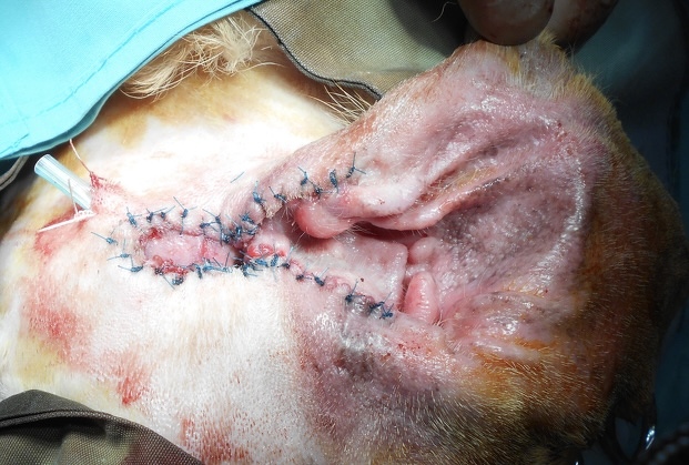 この写真は他の犬で行った垂直耳道切除術の写真です。耳道の換気を改善する目的で行われました。外耳道炎の症状は軽減しますが、大抵の場合で手術後も定期的な耳道洗浄を行う必要があることが多いようです。(つづく)