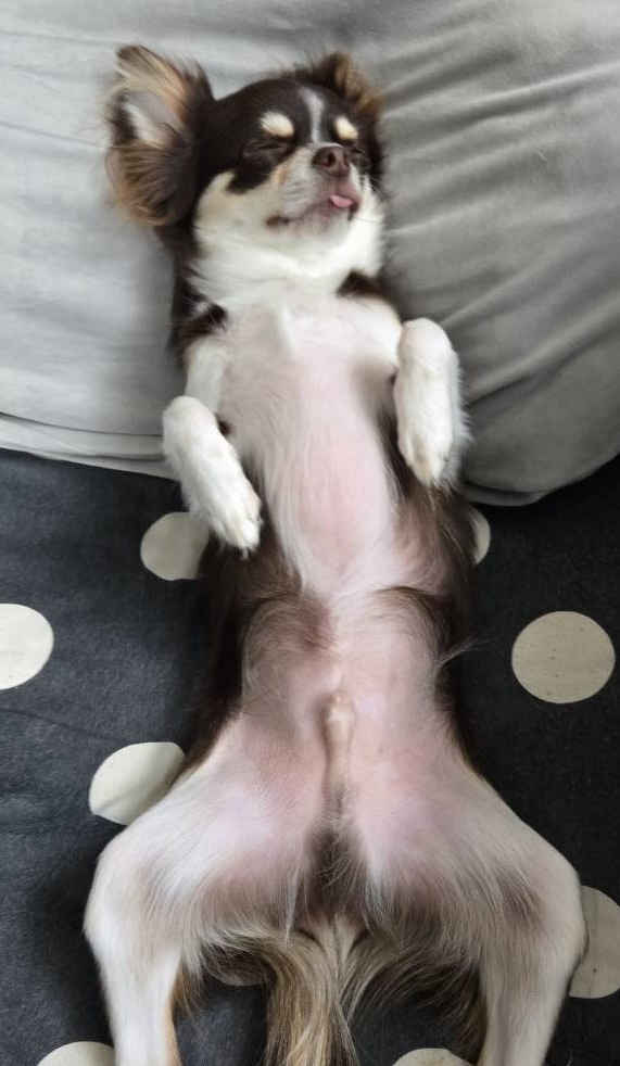 チョコタンのチワワの子の仰向けの写真です。首下から胸お腹にかけて正中線に沿ってかゆみを伴わない脱毛が認められます。このような位置にかゆみを伴わない脱毛が認められる場合、パターン脱毛を疑います。他にミニチュアダックス、ボストンテリア、パグなどの犬種に良く見られますが、健康上の問題がほとんど起こらないために、治療を行う必要はありません。(治療を行なっても回復する事例は少ないと思われます)