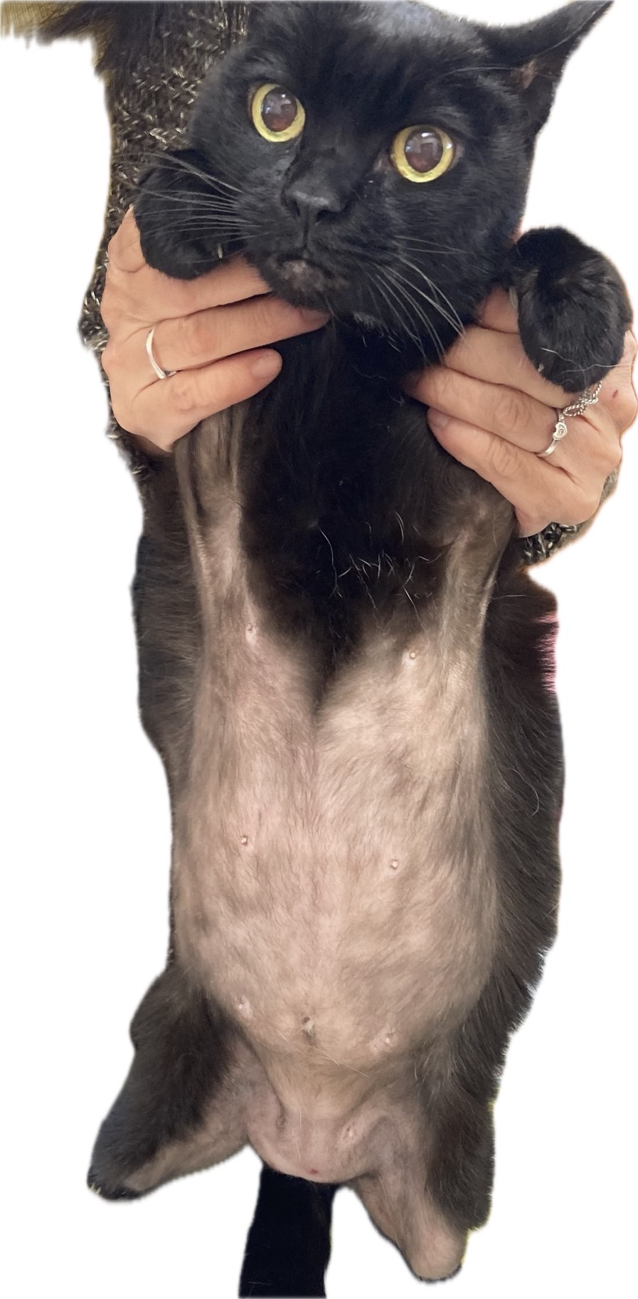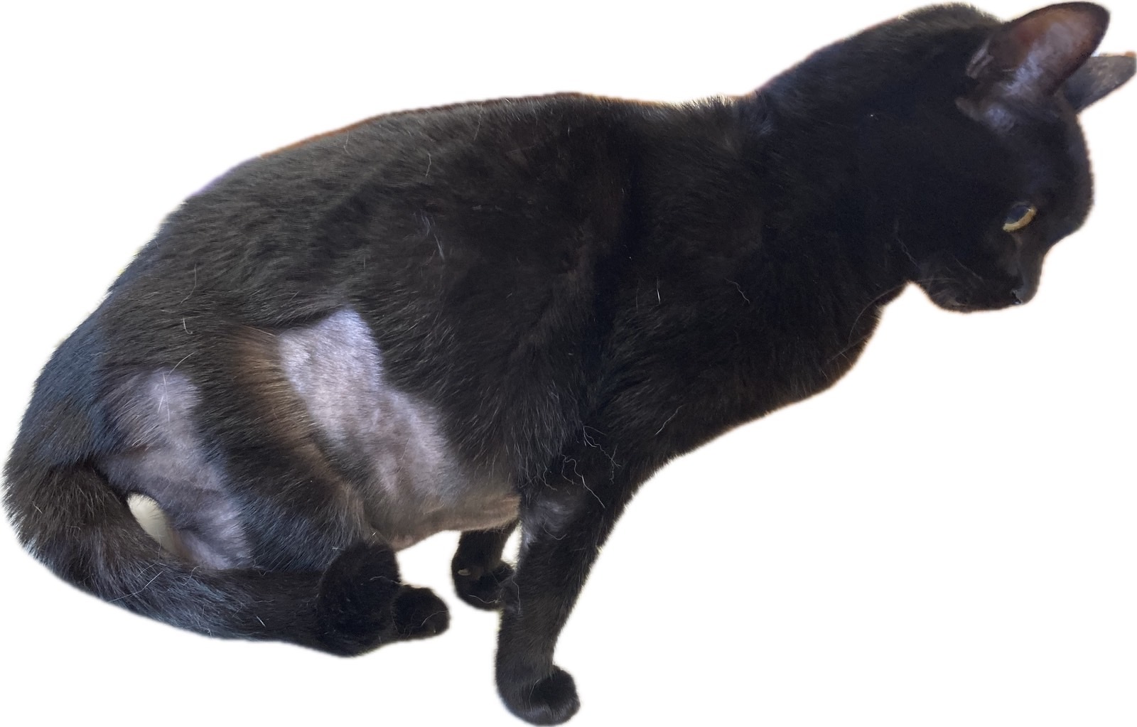 この子は左右対称性に腿の部分とお腹に赤みや湿疹を伴わない脱毛が見られます。飼い主さんは「ずっと舐めてる」ことを主訴に病院を訪れ、各種皮膚検査で寄生虫や酵母や真菌が否定的で、ステロイドの治療にも反応がないことから心因性の皮膚炎が疑われる事例です。皮膚表面を良く見ると、舐めすぎていることから発毛はあるが、毛が途中から切れているような脱毛を認めます。治療としては、姑息的な方法としてエリザベスカラーの着用や生活環境の整備などで対応しています。精神安定剤などの使用を検討することもありますが、体全体の異常につながる恐れがないときは、ある程度の治療で経過観察とすることもあります。