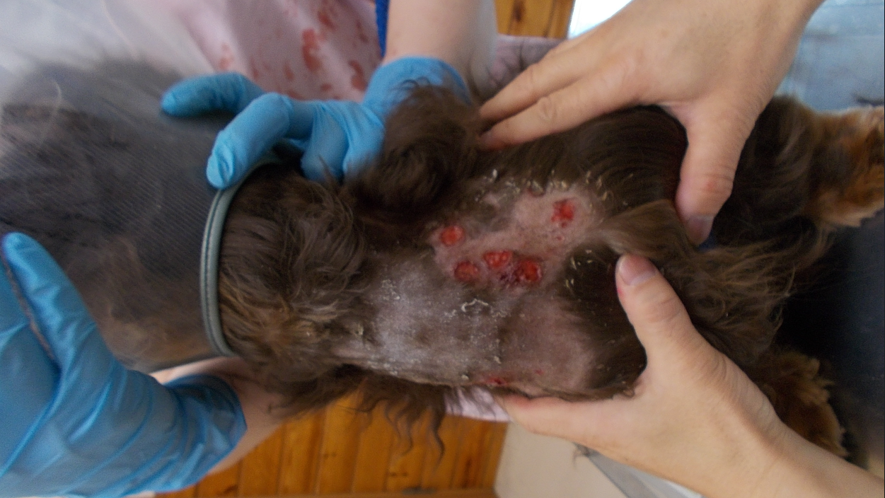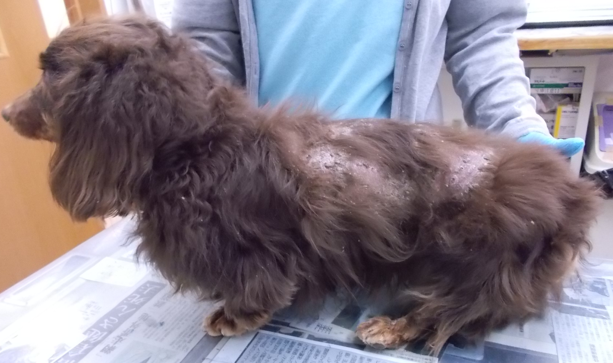 この子は非典型的な副腎皮質機能亢進症(クッシング症候群)の事例です。アレルギーや感染性の皮膚炎として長い間治療してきたが治らないとの主訴で来院されました。来院時は身体中が痛くて、気が立っていて、痛々しい状態でした。