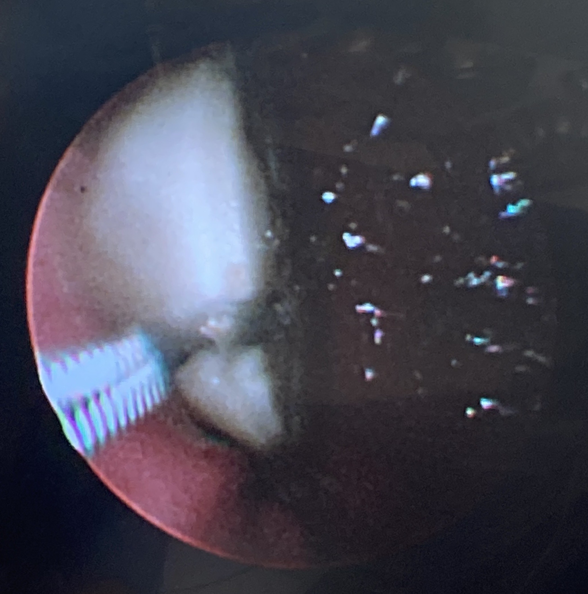この画像は丸い白い異物を飲み込んだフレンチブルドックの内視鏡画像です。催吐処置を行なっても吐出できなかったため、内視鏡での摘出を試みました。胃の中で白い物体を内視鏡の把持鉗子で掴んでいるところです。