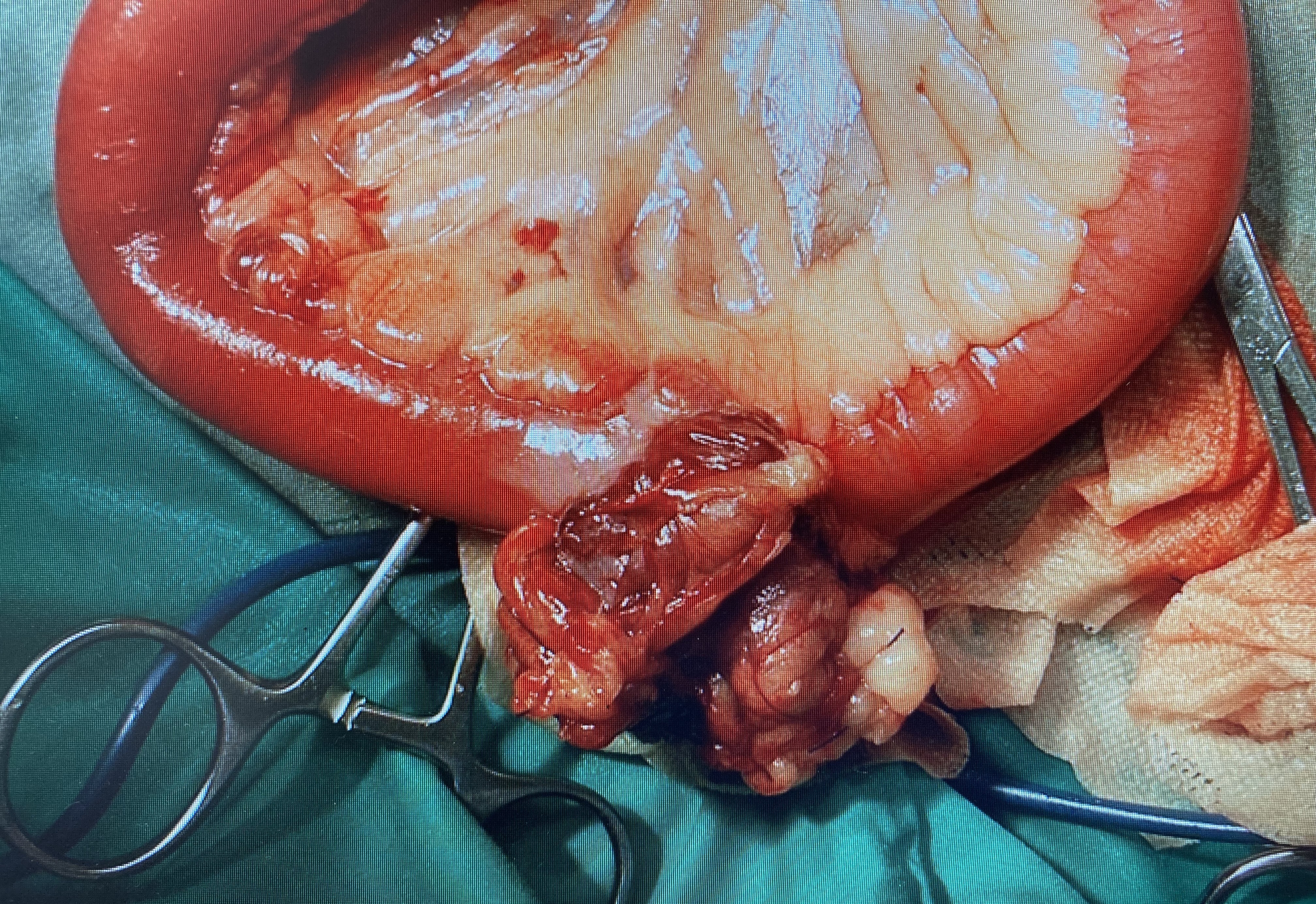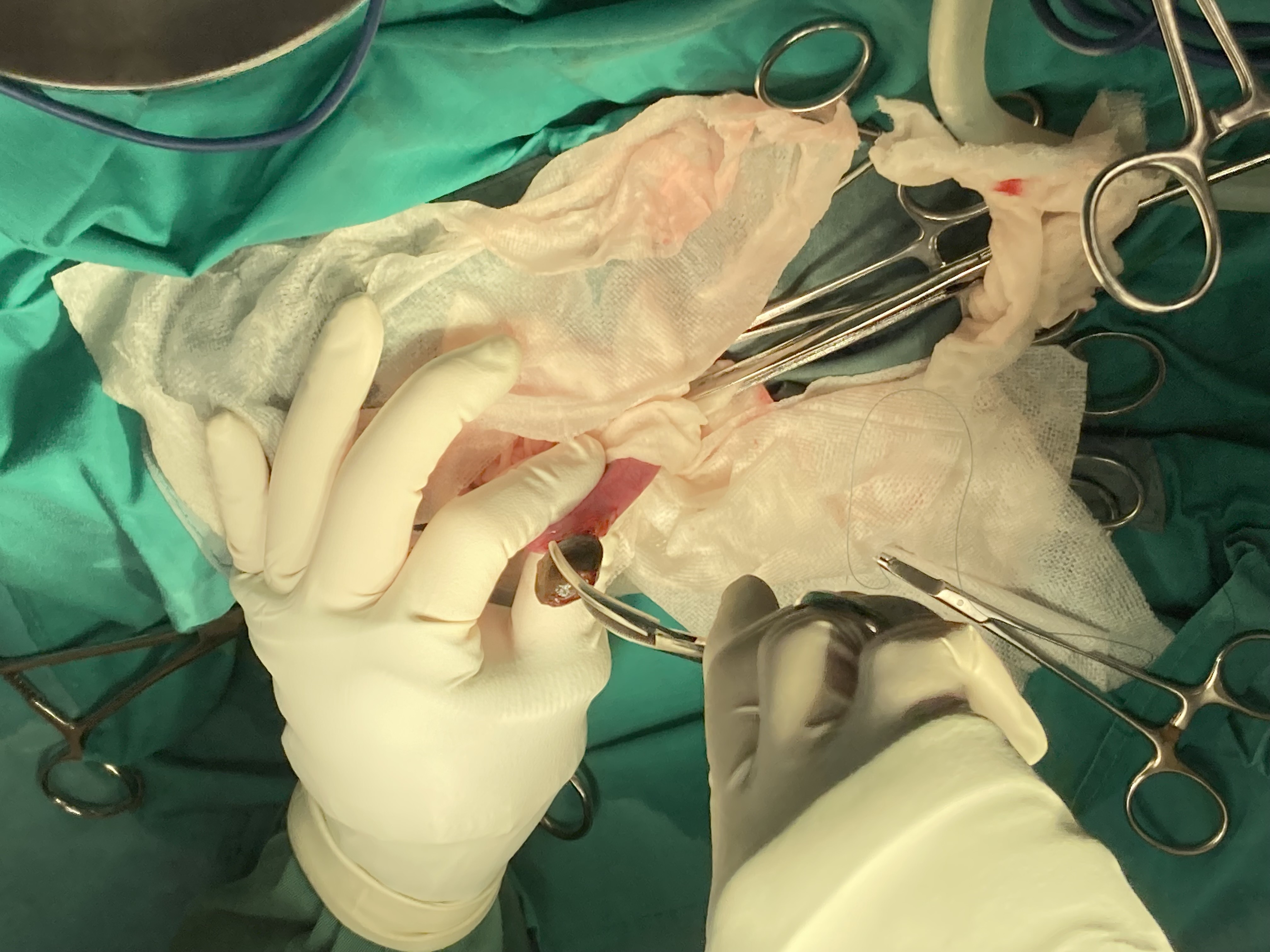 高齢のミニチュアダックスの腸閉塞事例です。小腸に腫瘍が出来ていて腸の通過を塞いでいました。腸の端端吻合術により回復して、今は元気にしています。腸の腫瘍はリンパ腫や腺癌などが生じることがあり、腫瘍に応じては再発することがありますので、術後の病理検査によって正確な診断を行うことが大切になってきます。