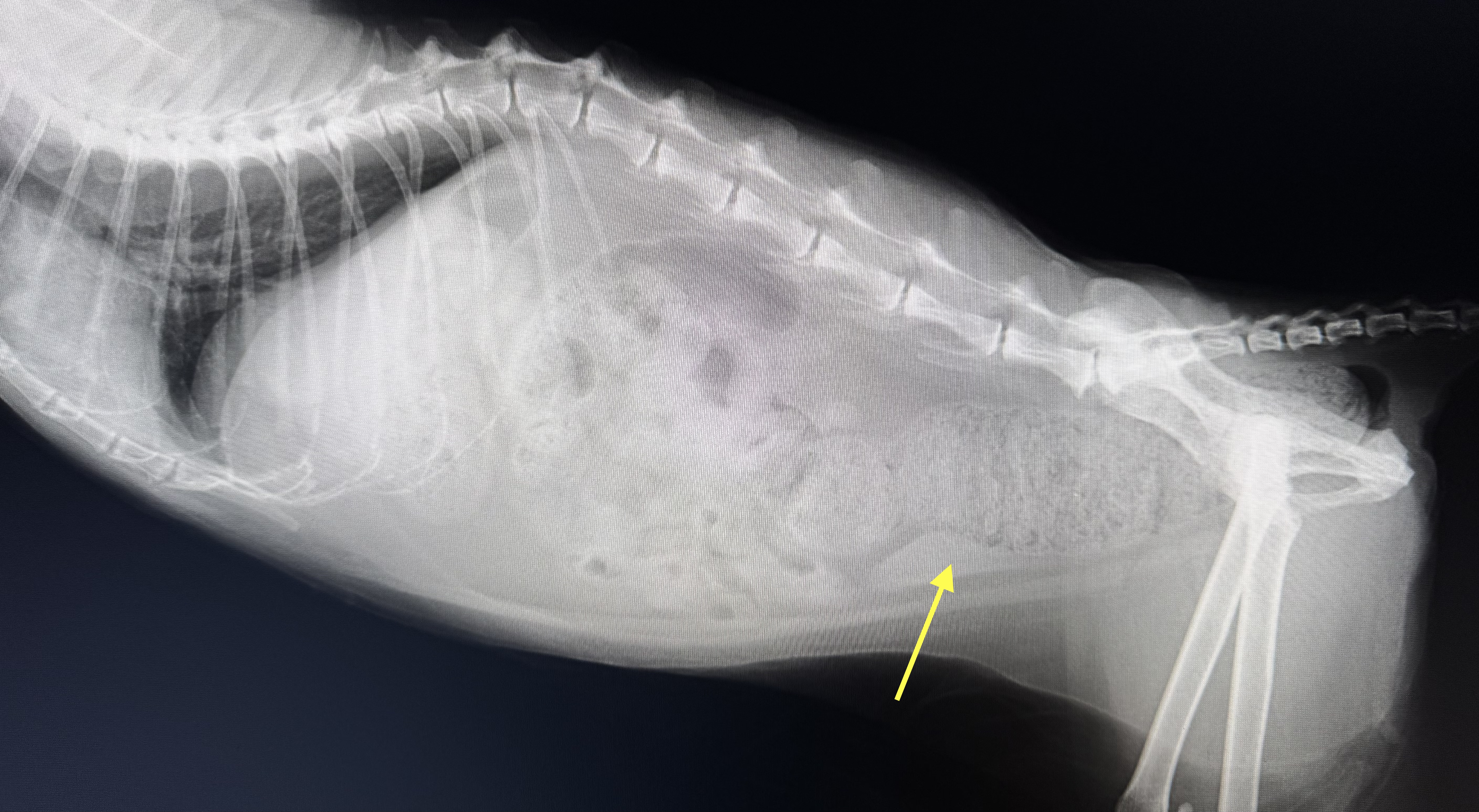この写真は便が出なくなって、きばっていることを主訴に来院された13歳の日本猫の腹部レントゲン写真です。黄色矢印のところに大きな糞便の塊があることがわかります。骨盤(腰の骨)と比べて、そのスペースを出るか出ないかの大きさになっています。このような子は巨大結腸症と言われる病気になっており、大腸の運動が低下して、排便が滞り、大腸内に大量の便が貯留してしまうことになります。食欲も減退し、嘔吐が見られることもあり、早急に大腸内の糞便を取り除くために、浣腸や摘便処置が必要になります。この子はその後可溶性繊維を含む、専用の病院処方食に切り替えることで排便を促すことに成功し、今や20歳を超えるまで元気にしています。