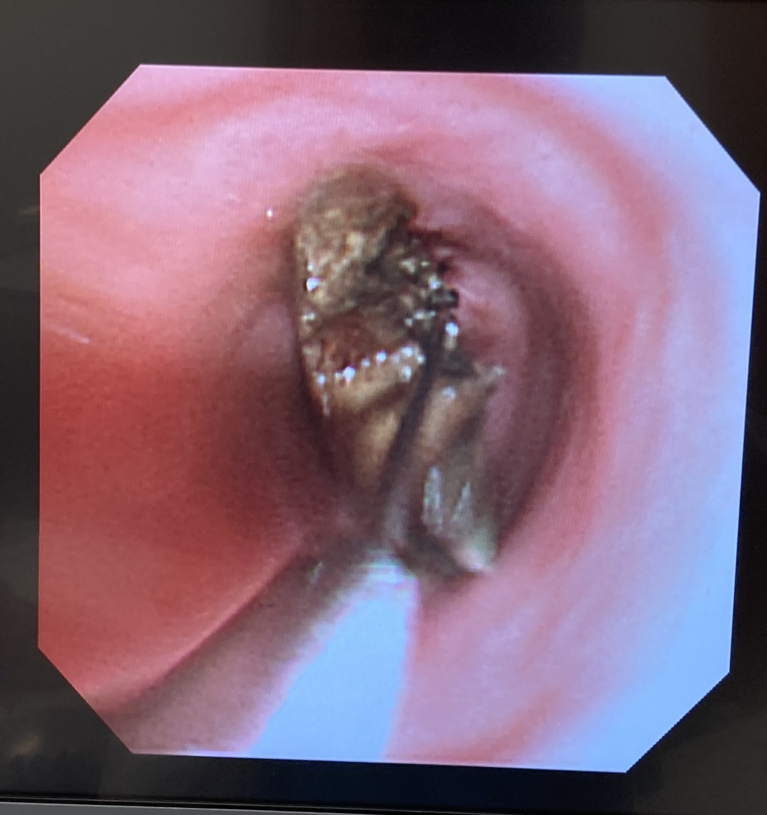 この写真は嘔吐が続いて食欲がなくなった猫の胃の内視鏡時の写真です。処置前に腹部エコー検査をしたところ、胃の中に何か異物らしい陰影と胃の中の液体貯留所見が認められたため、内視鏡による胃内異物摘出の処置を全身麻酔下で行いました。胃内にウレタンマットの破片と思われる異物があったため、鉗子を用いて摘出を行いました。この子は大腸内にも固い糞便が停滞していそうだったため、内視鏡の処置後浣腸を実施し、摘便処置を行いました。