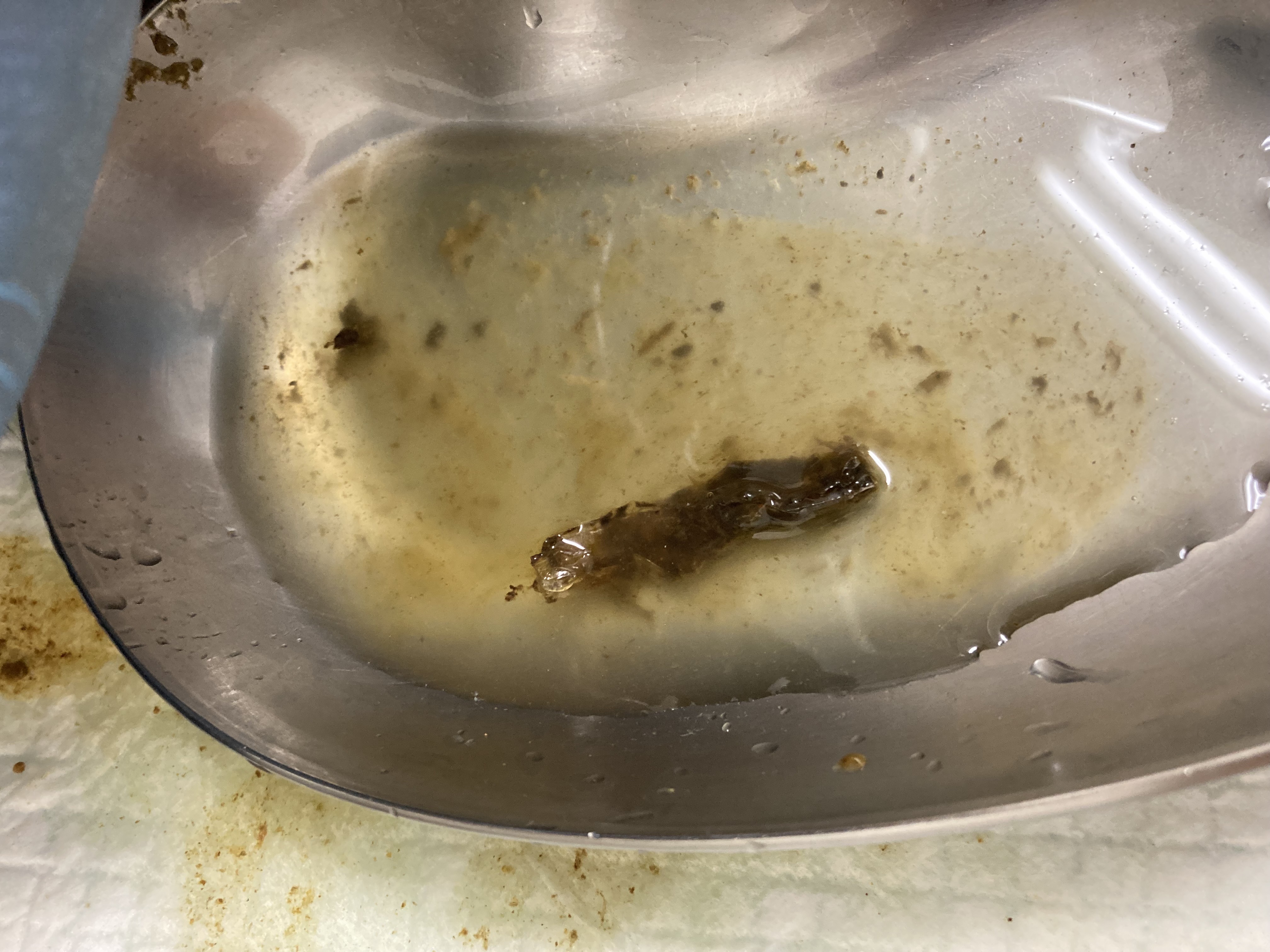出てきた便の中にビニールの異物や小さいウレタンマットの破片も出てきました。処置後猫の嘔吐はなくなり、症状は改善しました。猫は、ヒモ状の異物やビニール性の異物、ウレタンマットなどの異物を好んで飲み込むことが多く、一度異物誤飲をした子は何度も行う傾向があります。このようなものを猫の生活圏から除外することが必要になるので、ご注意ください。