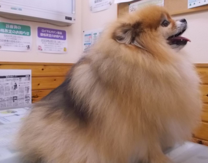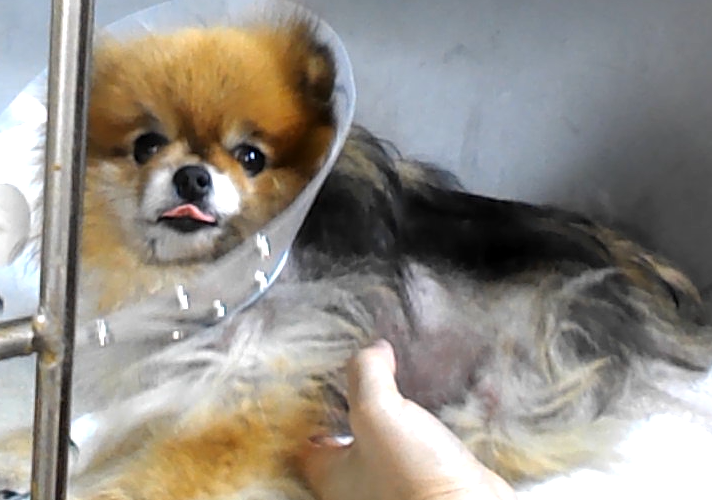 この4歳の女の子のポメラニアンは、タンパク喪失性腸症の非典型事例の子です。初診時は子宮蓄膿症で来院されました。その時の容貌は写真の通り毛並みが揃っていなくてアロぺシアXと呼ばれるポメラニアンの無毛症と思われる状態でした。若くして発症した子宮蓄膿症の手術後の立ち上がりが悪く、追加検査をしたところ、低タンパク血症が認められました。腎臓からのタンパク喪失が認められなかったため、タンパク喪失性腸症として治療を開始すると元気になってゆきました。低タンパク血症は体の様々な働きを低下させるため、若くして子宮蓄膿症を発症したのはこのためだったかもしれません。