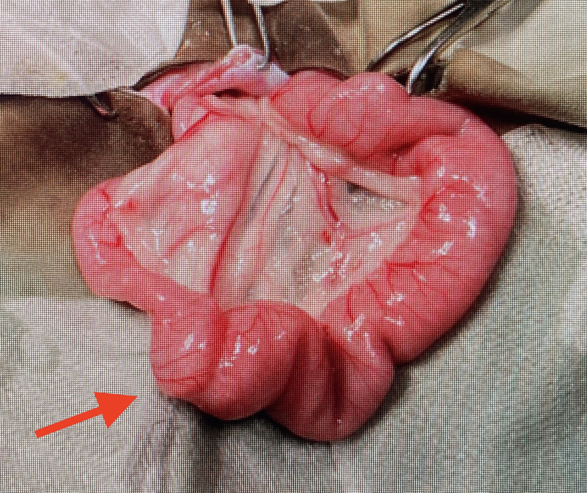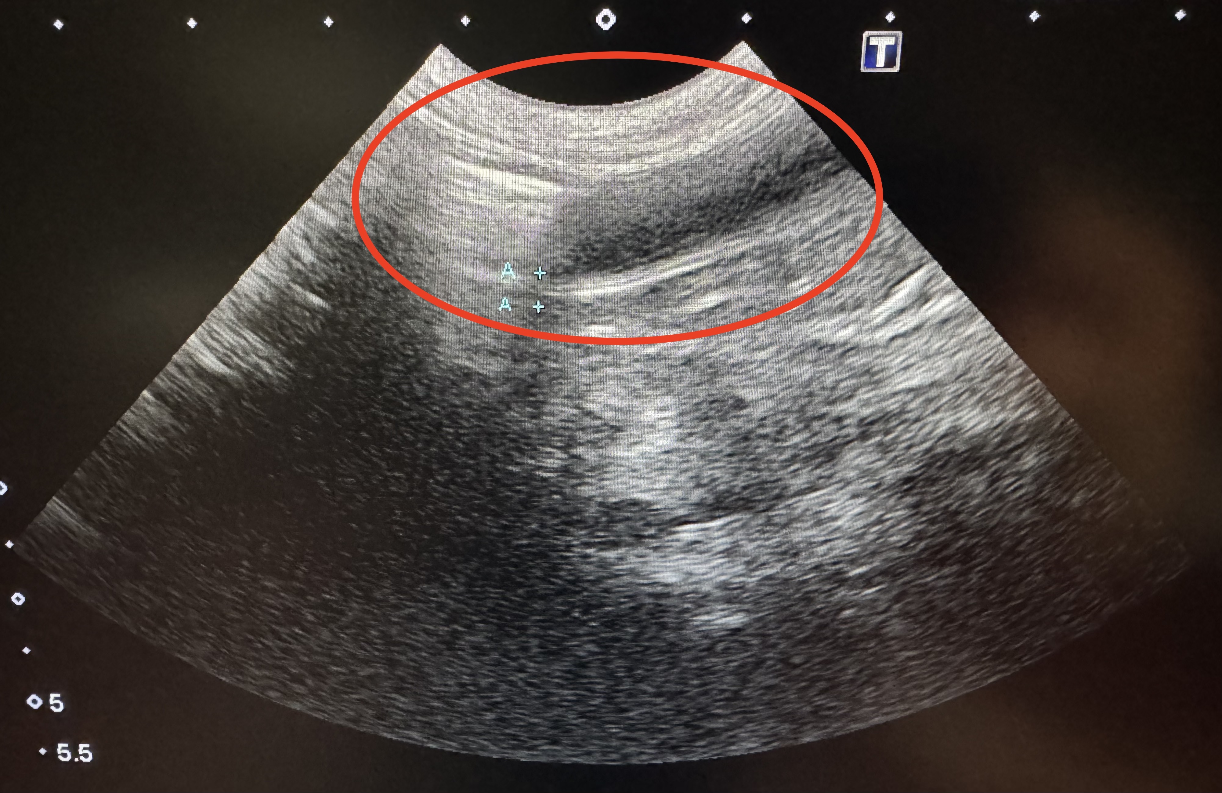 12歳の日本猫のケースです。慢性的な体重減少(2.75Kg)で来院されました。腹部エコーを実施したところ、小腸で音響陰影(白く跳ね返る)を伴う液体貯留(黒く見えるところ)所見(写真の赤丸のところ)を認めました。これは腸の通過がうまくいかない何かしらの問題(異物で詰まっているか、小腸腫瘍などで詰まっているか)が生じている可能性があり、外科的に問題を解決する必要があります。このため、術前検査で手術の安全性を確認後、開腹手術となりました。