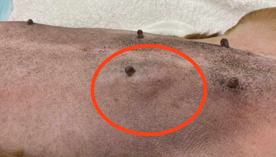 犬の乳腺腫瘍には画像のように有茎状(イボの塊が皮膚から分離している)ものや