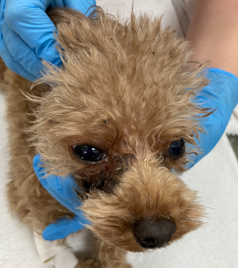 トイプードルの涙やけが悪化して目の内側の皮膚がただれてしまった事例です。涙やけは悪化すると難治性の皮膚疾患を継発してくることがあります。