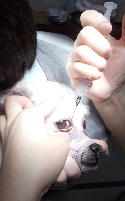 食生活を改善し、その子に合った総合栄養食を見つけられると、涙やけが改善する事例をたくさん経験しています。それでも難しい場合は、点眼薬で慢性的な結膜炎の管理や、顔まわりの毛をカットして目の刺激をなくすことと合わせて、写真のような涙管洗浄を定期的に行い涙管を再開通させることで、涙やけの悪化を防ぐことができることがあります。涙管洗浄はおとなしい子であれば、無麻酔で対応できることがありますが、麻酔下で行うこともあります。