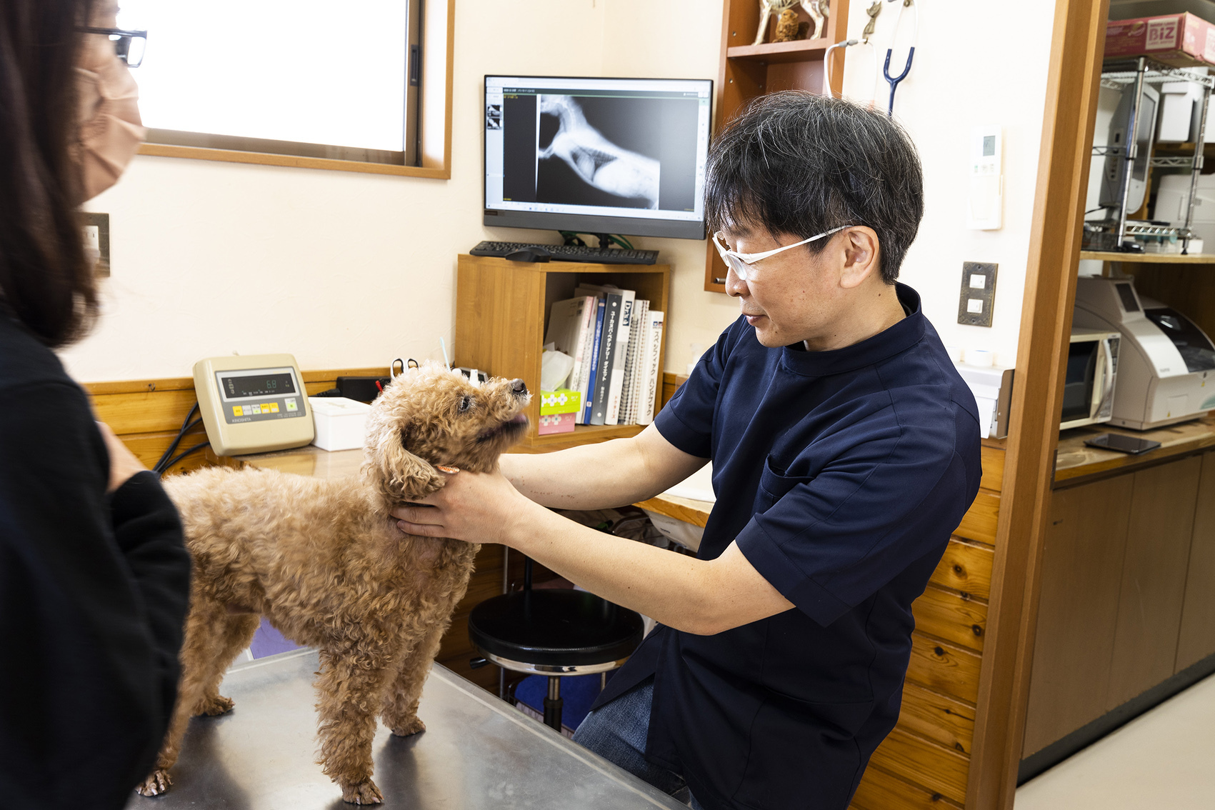 病気の動物を診察するにあたり、まず飼い主さんの話を聞くことから始まります。飼い主さんが自分のペットに対してどのようなことを心配しているのか、動物はどんな症状を起こしているのかについてお話を聞きます。動物は話ができませんから、飼い主さんのお話は、獣医師にとって病気の原因を探る重要な情報源となります。いろいろお話を聞くのは病気の原因を探るためですので、ご協力をお願いします。
