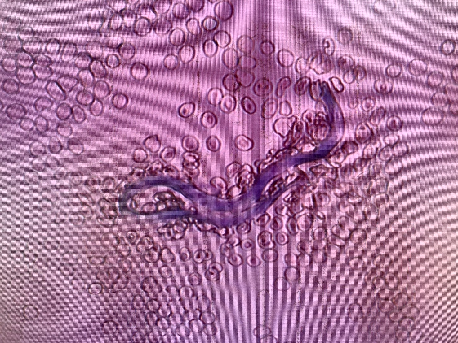 この子の血液を顕微鏡で見ると透明な細いフィラリア幼虫が血液の中を動いていることがわかります。蚊が吸血するときこの子虫を一緒に吸い上げて、他の犬を吸血することで感染してゆきます。フィラリアの予防をしっかりしておくと感染することはありません。フィラリアの予防は愛犬の命を守るために非常に重要です。